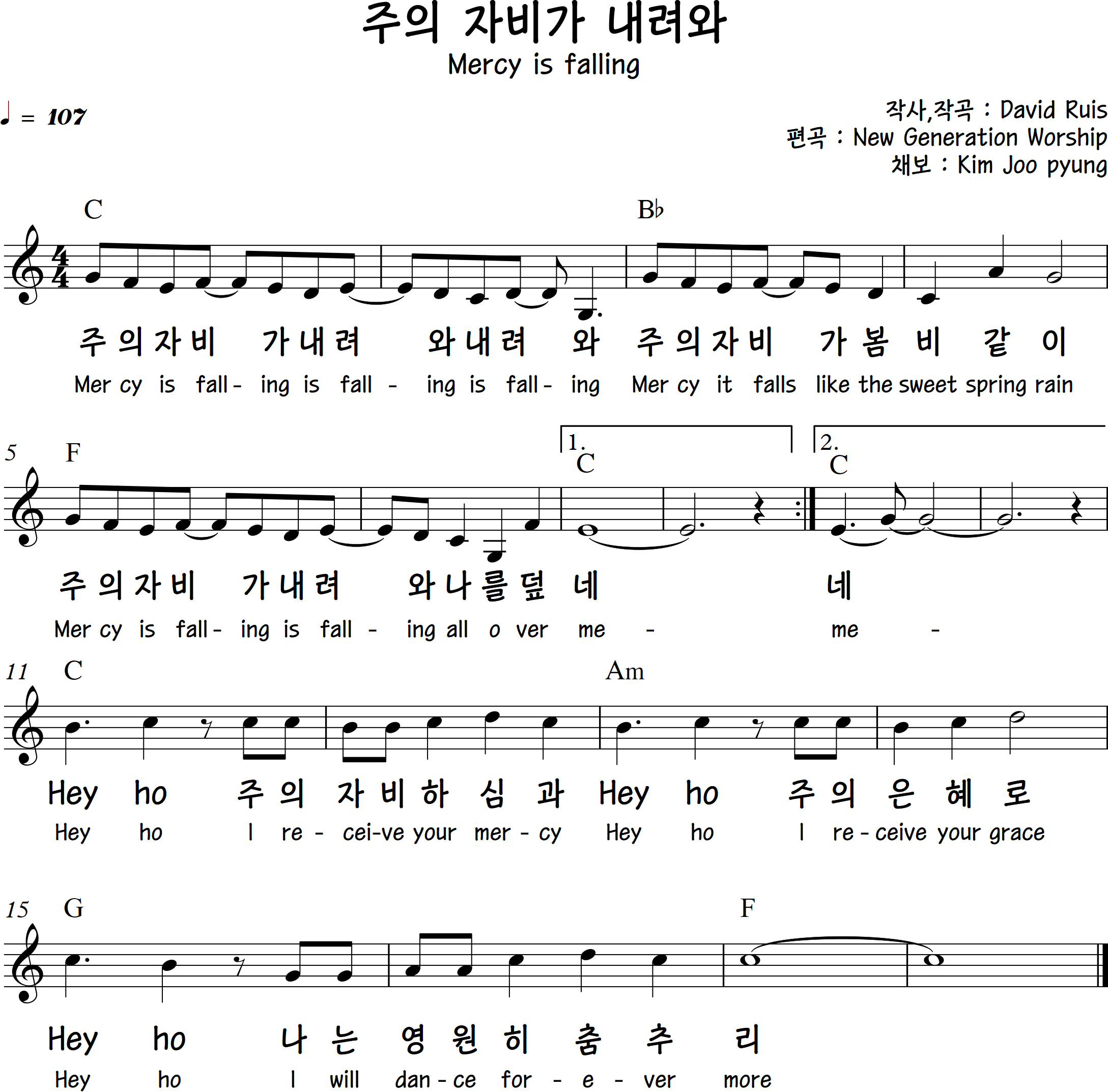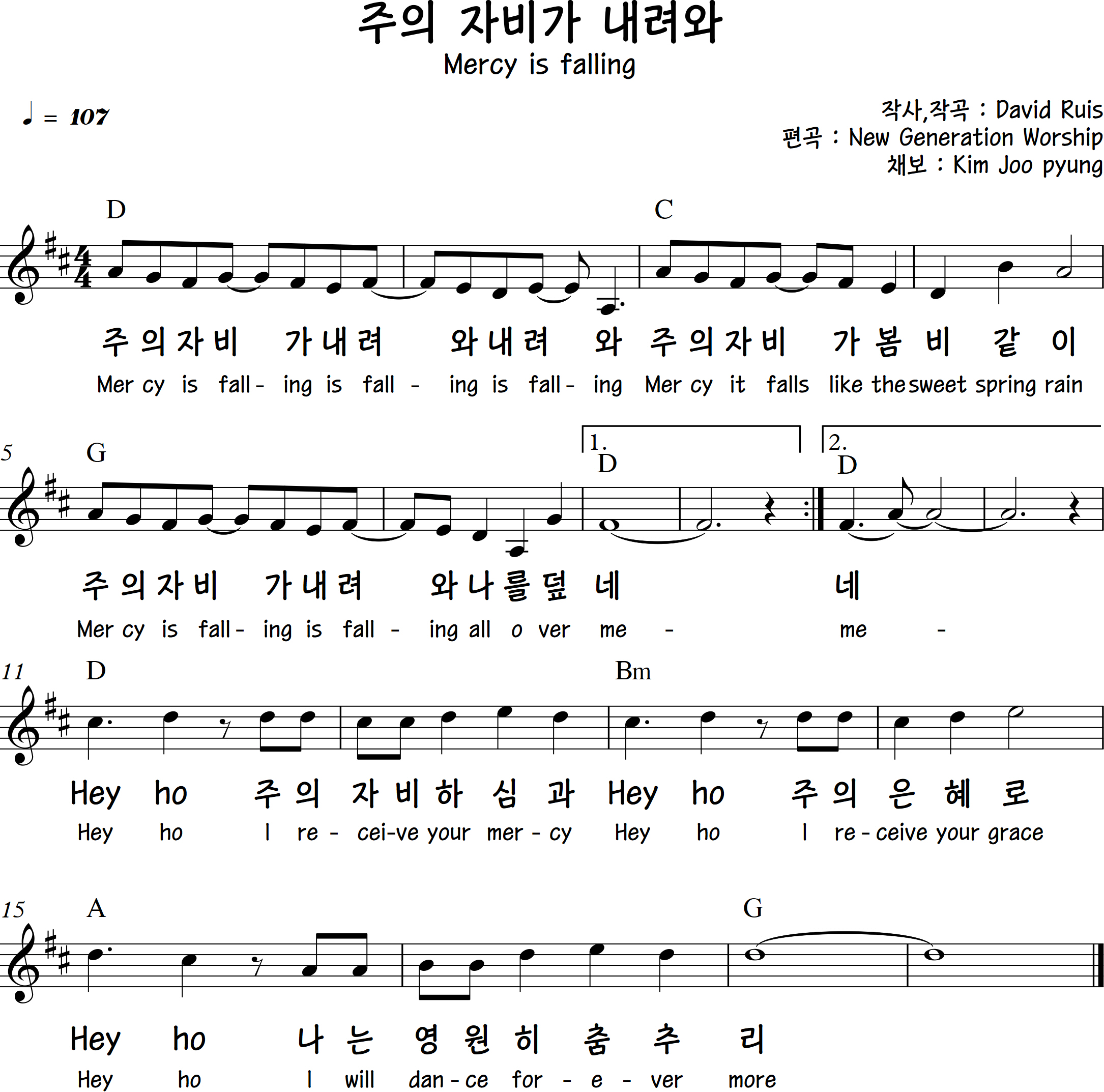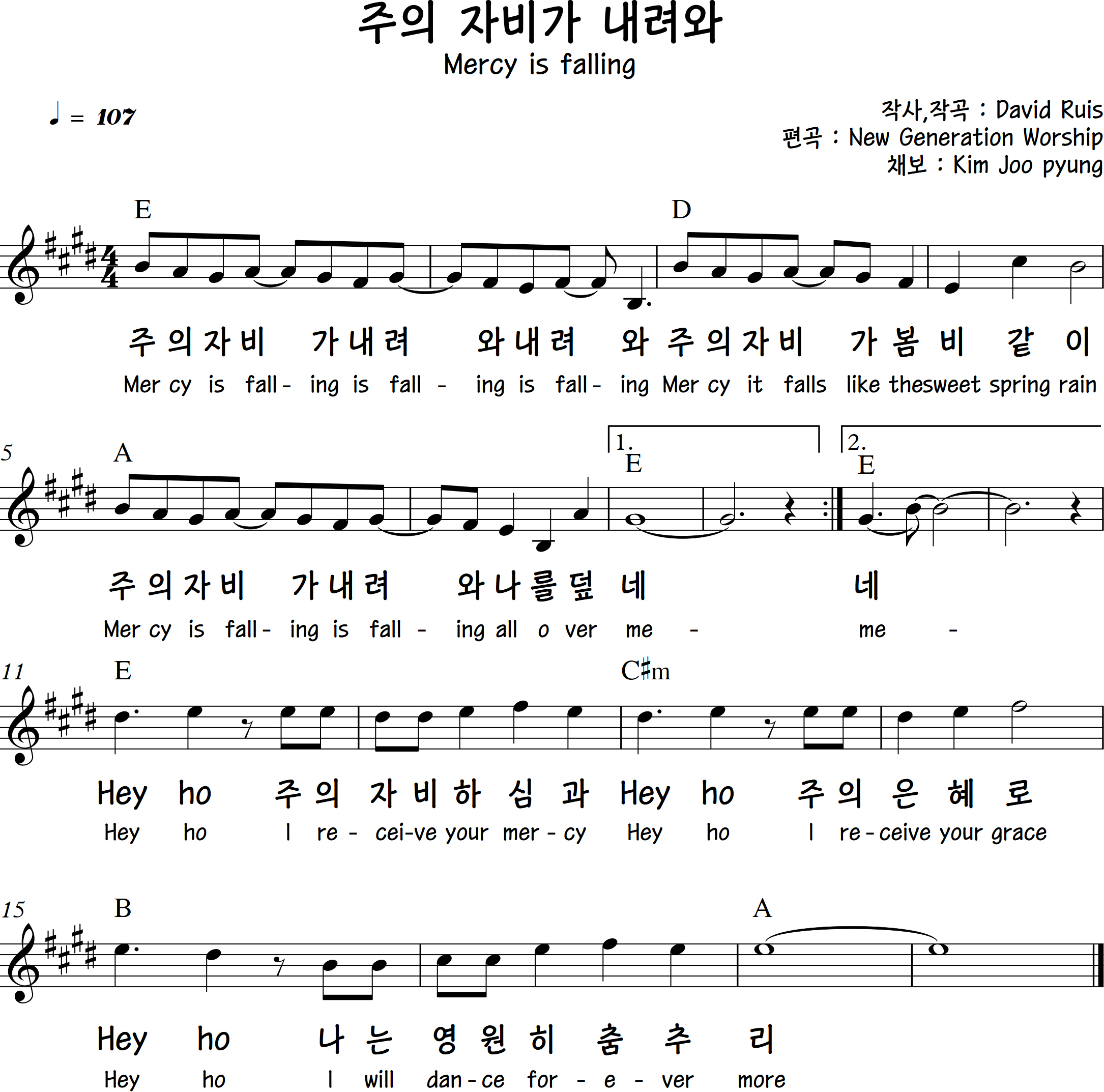 주의 자비가 내려와 - 뉴제너레이션 워십 편곡 버젼 악보 (D,C,E 키)