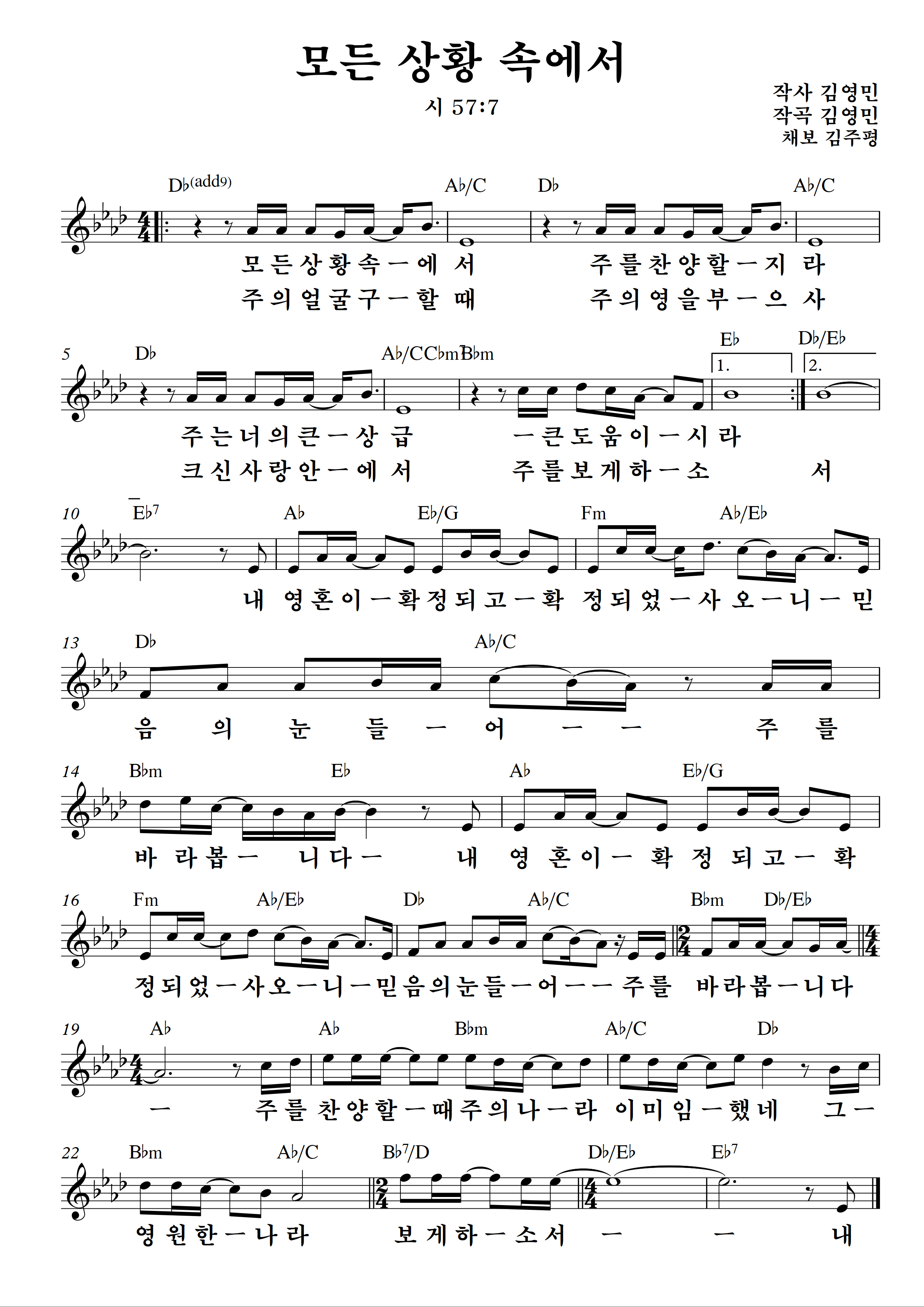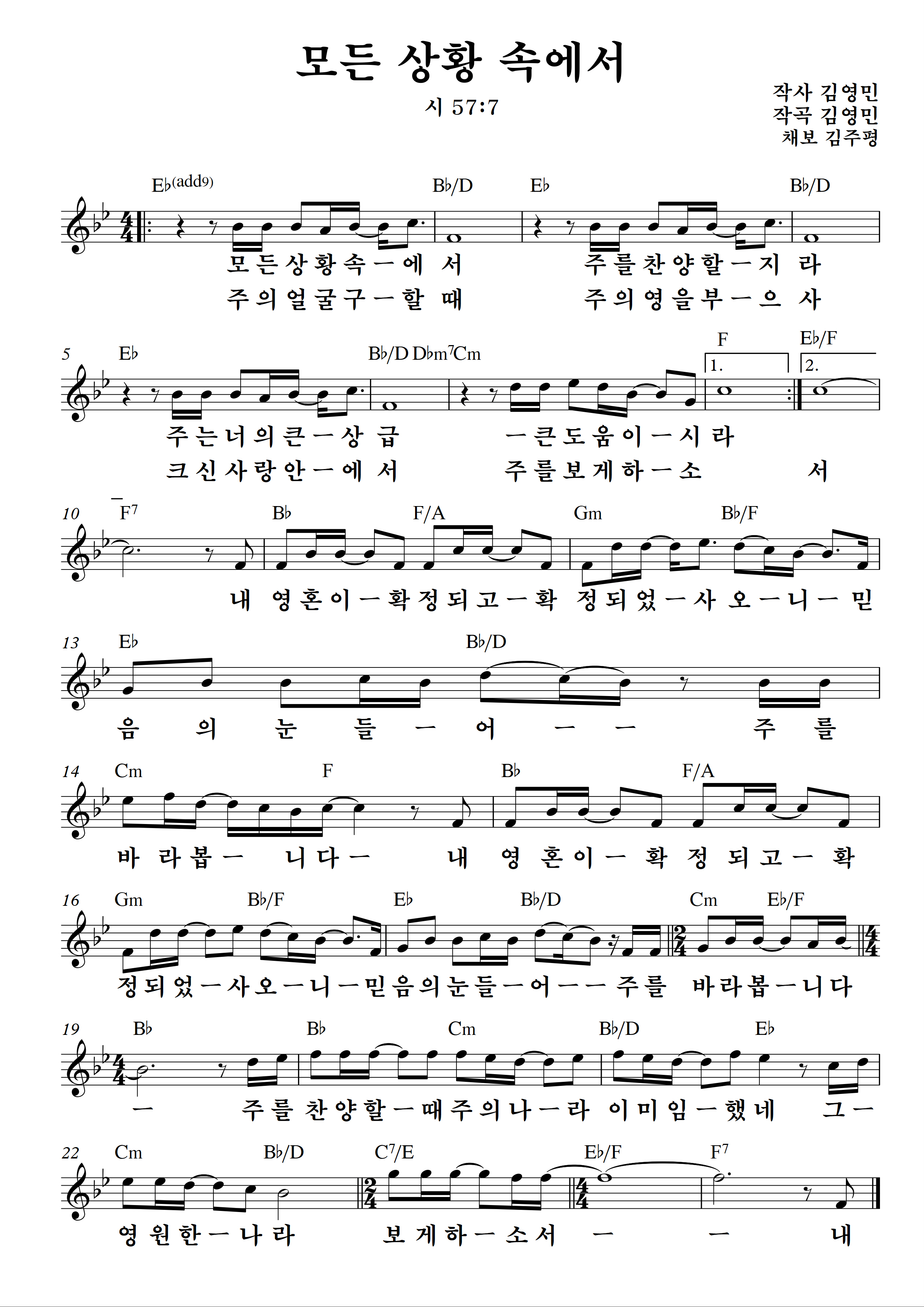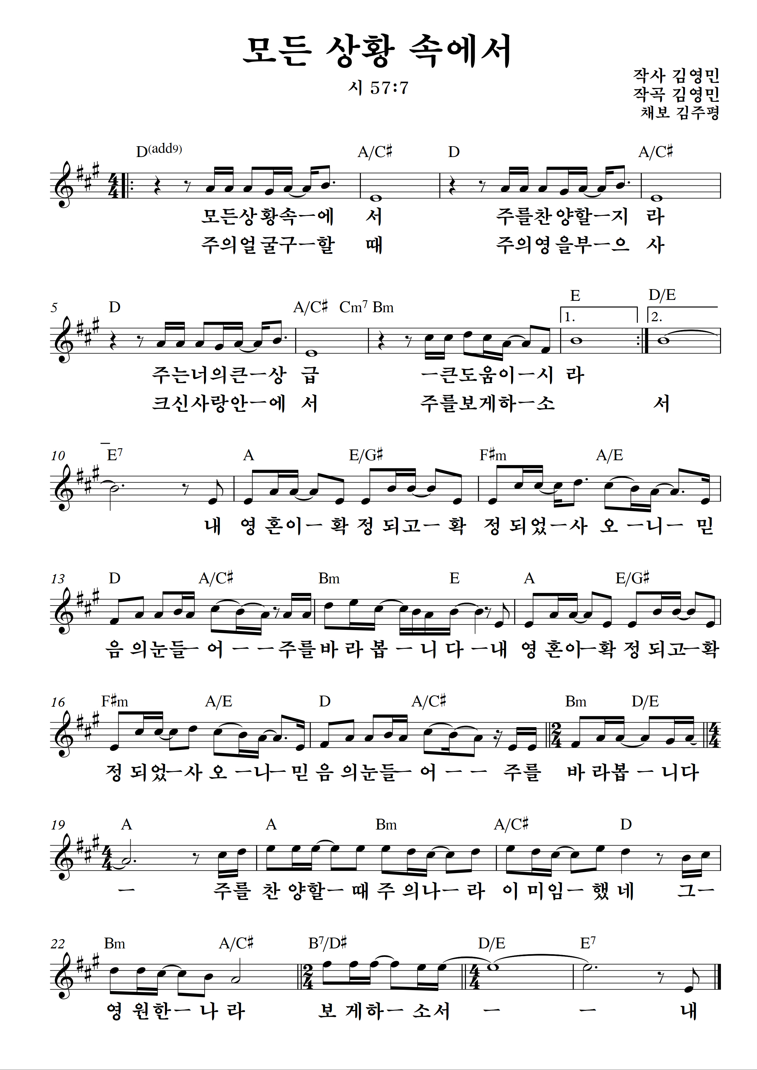 우리에게 잘 알려진 찬양 '모든 상황 속에서'의 악보입니다.