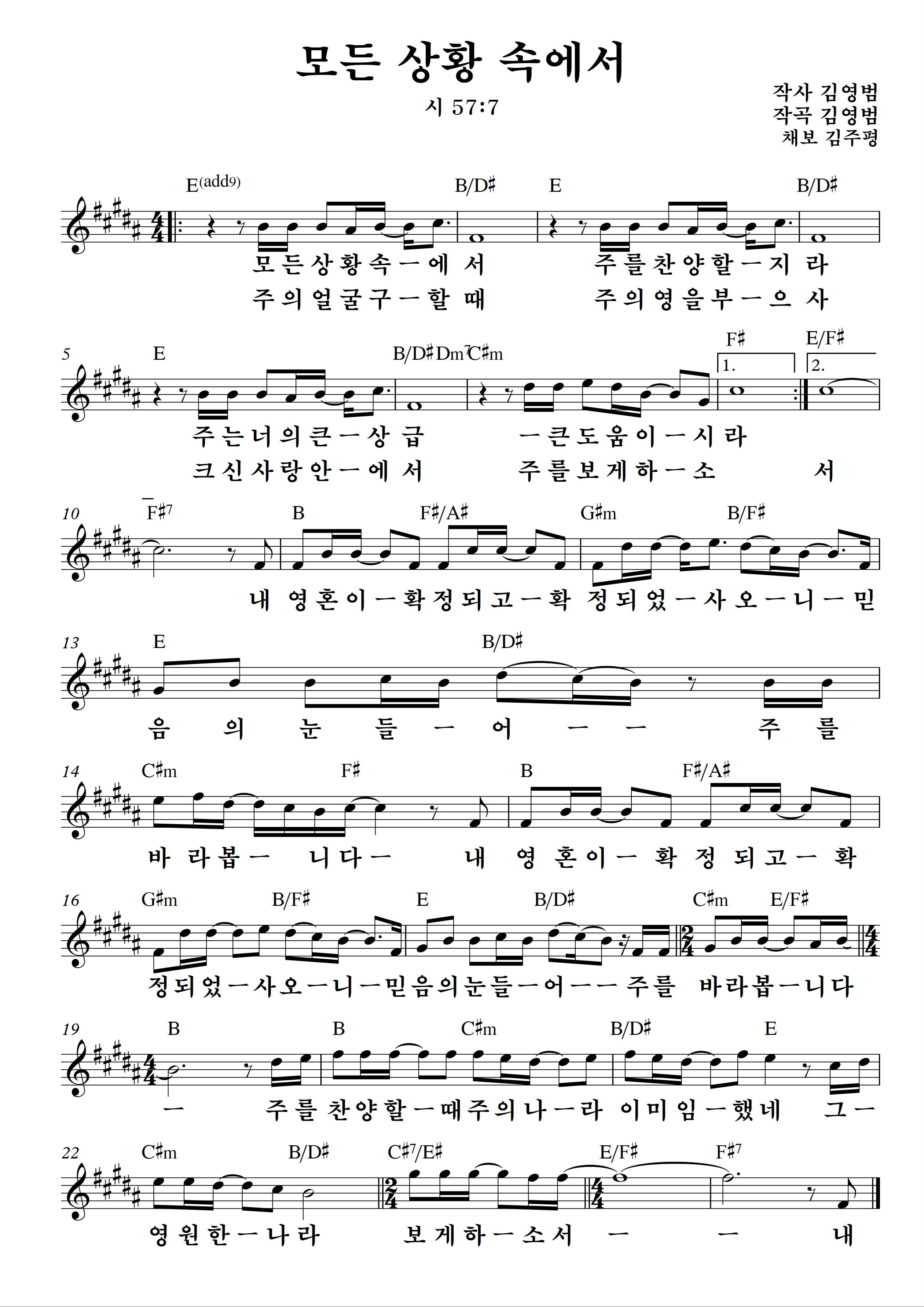 우리에게 잘 알려진 찬양 '모든 상황 속에서'의 악보입니다.