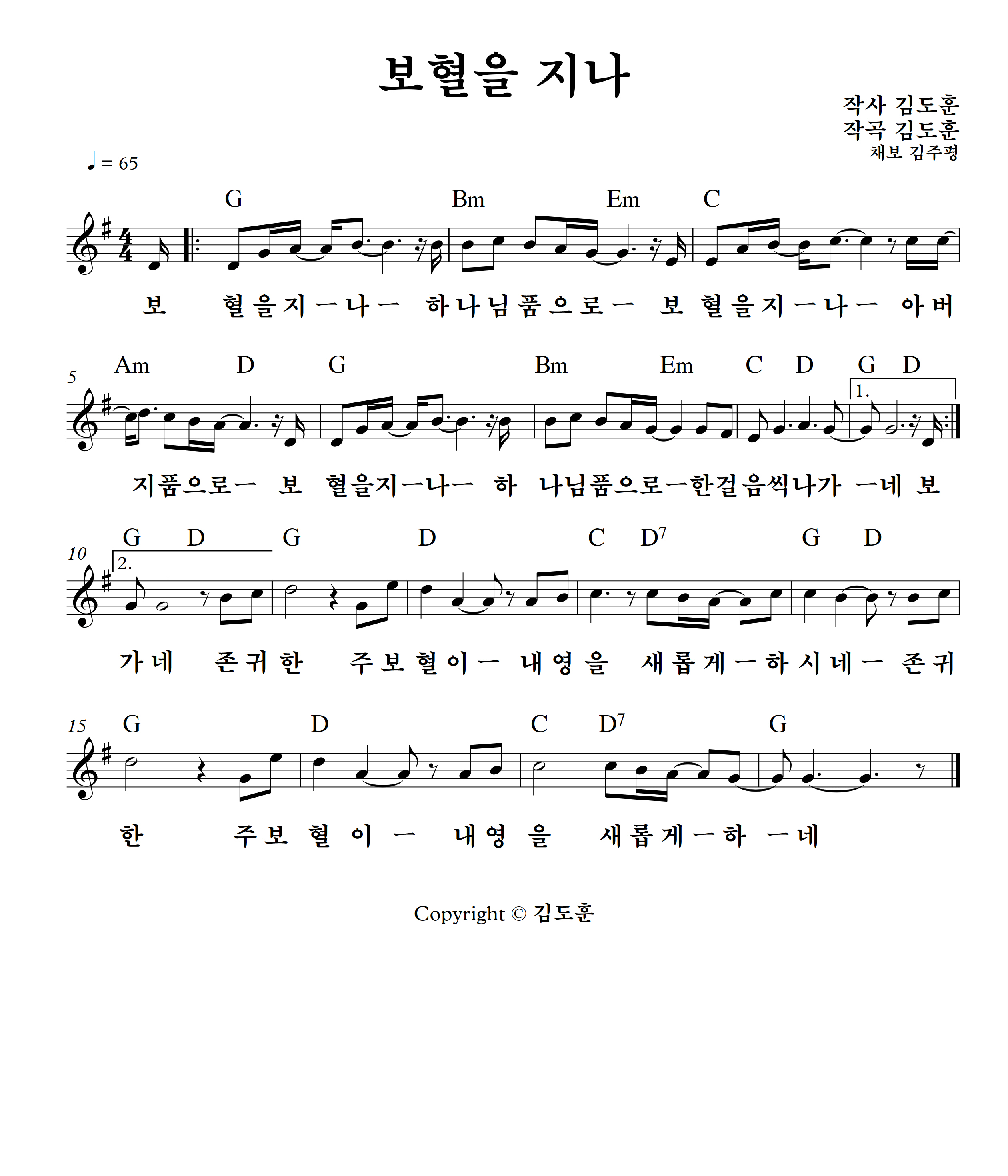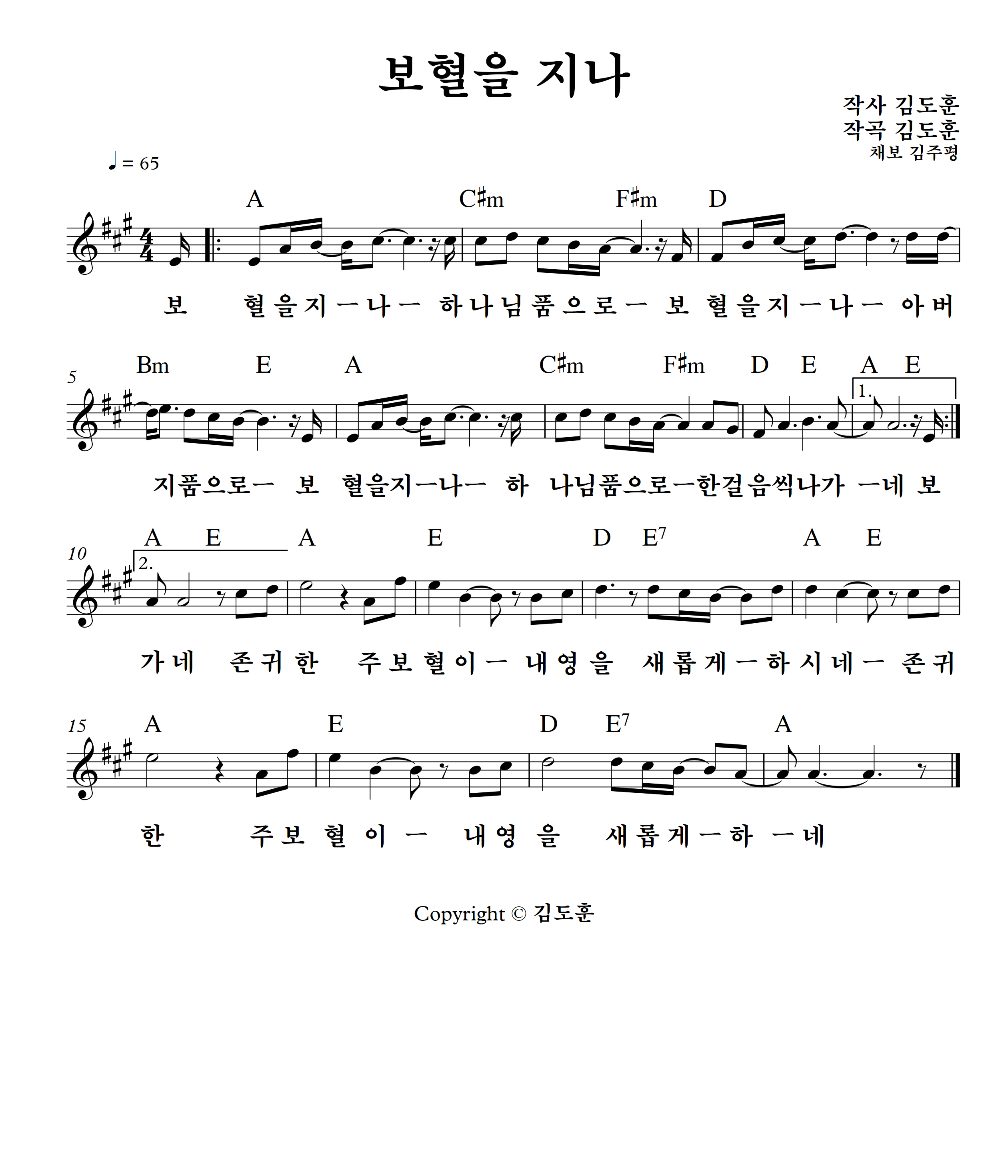 잘 알려진 복음성가 '보혈을 지나'의 악보를 그렸습니다.