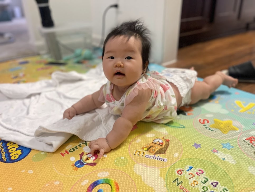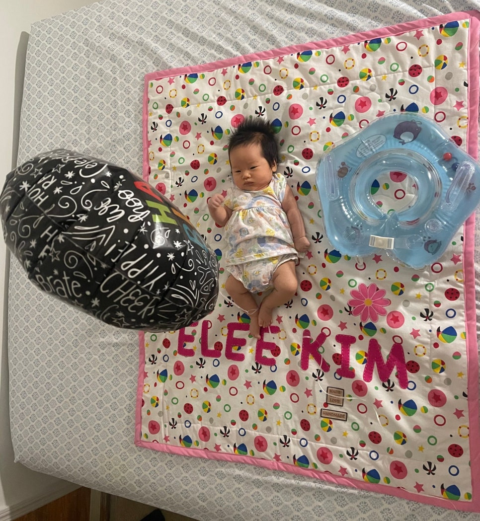 The mat she’s lying on was a gift from a church member, who embroidered "ELEE KIM" on it.