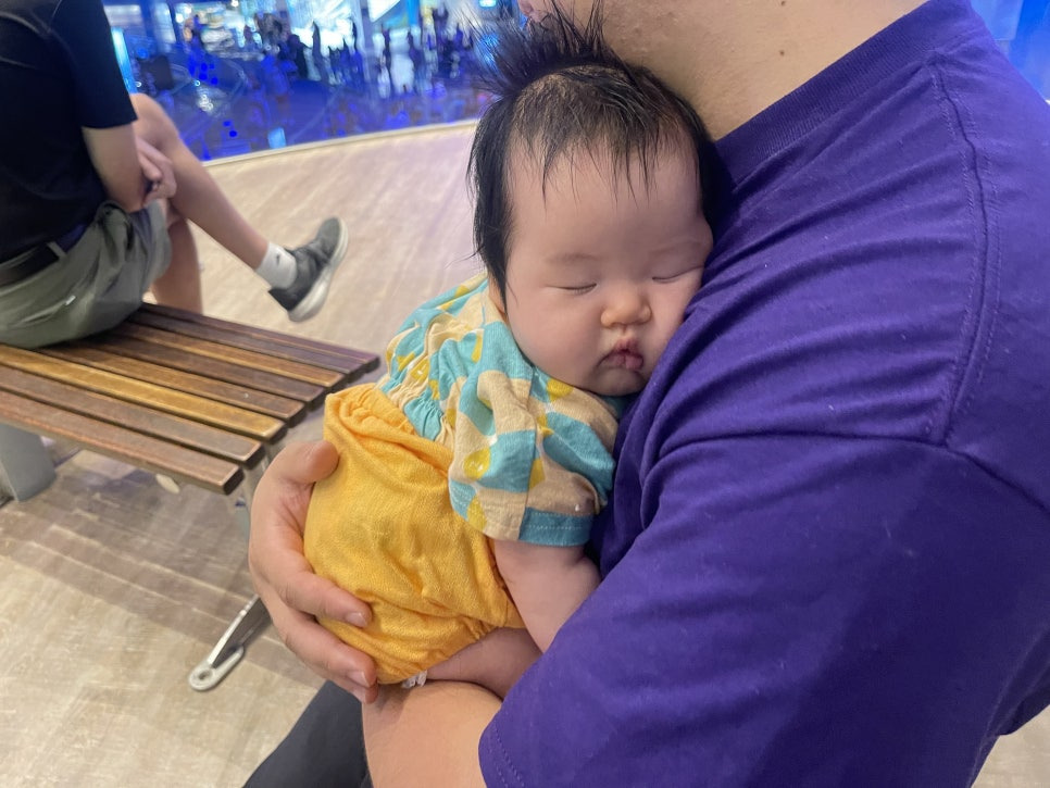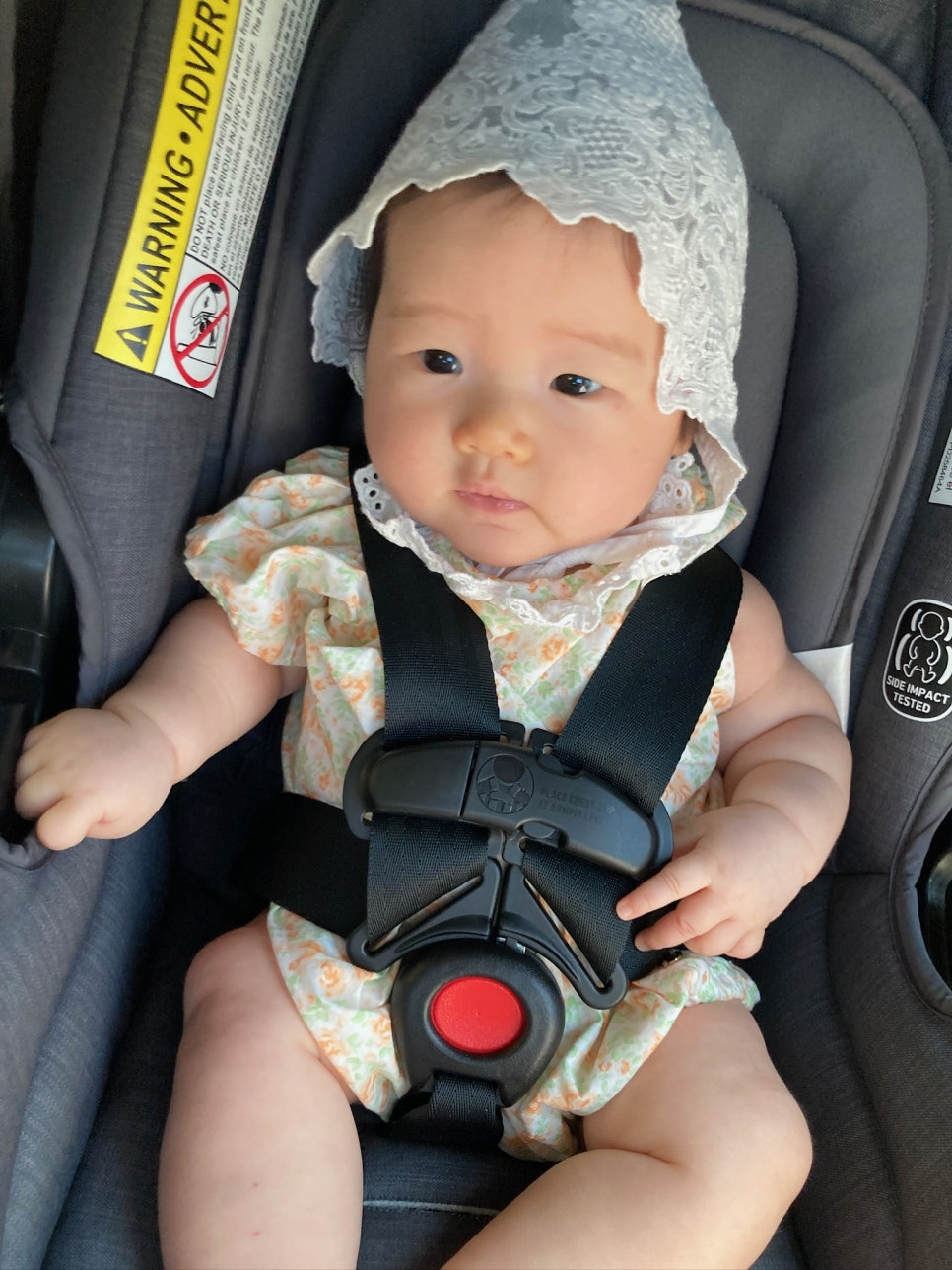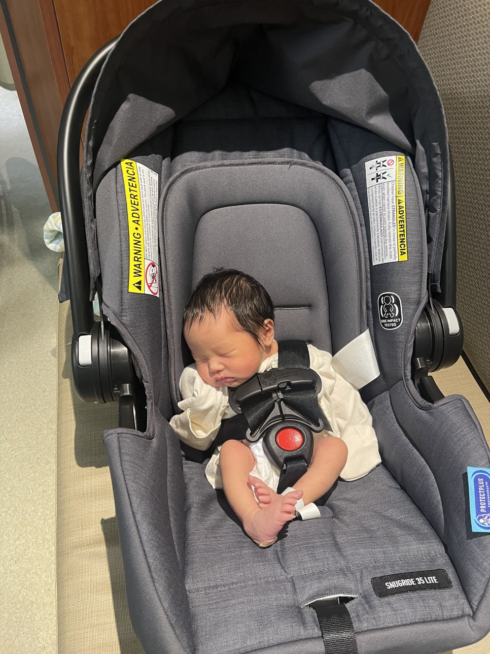 We secured Suheun in the car seat, showed the attendant, and received clearance to go home.
