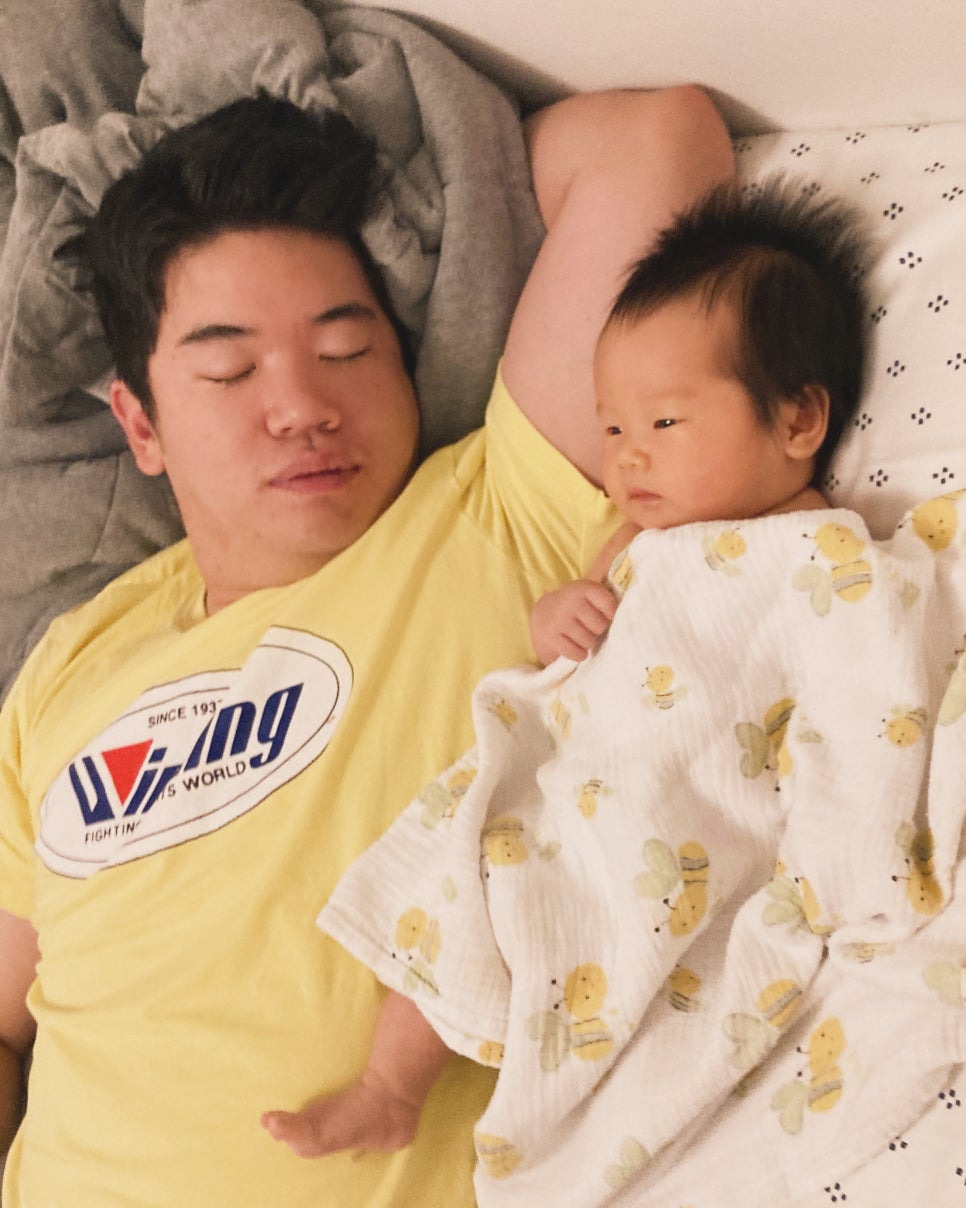 Suheun's sleeping pose is incredibly cute. She reminds me of Rodin's "The Thinker." Exhausted, I lay down on the bed, and my wife placed Suheun next to me. The way she rests her feet on my stomach is both cheeky and adorable.