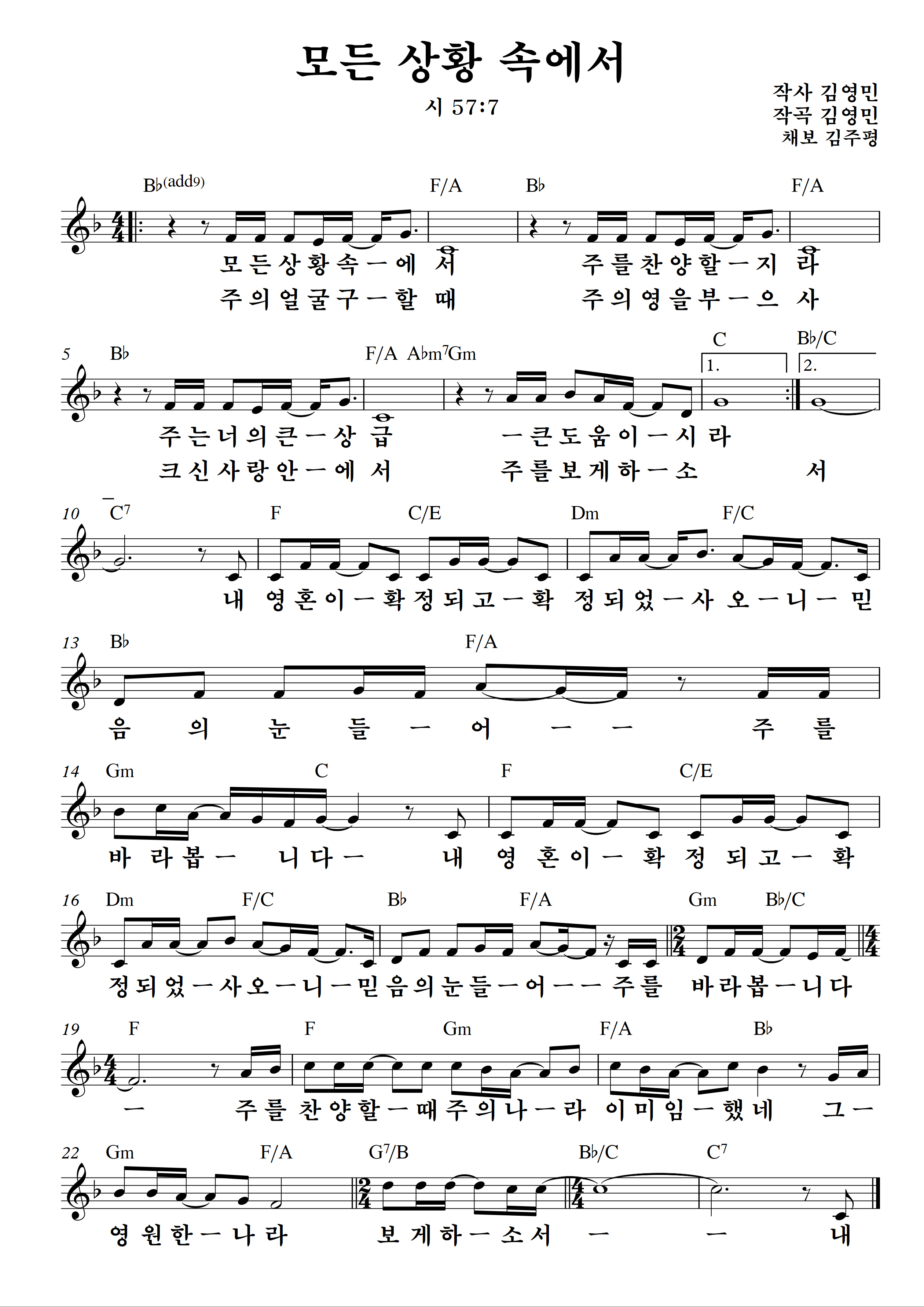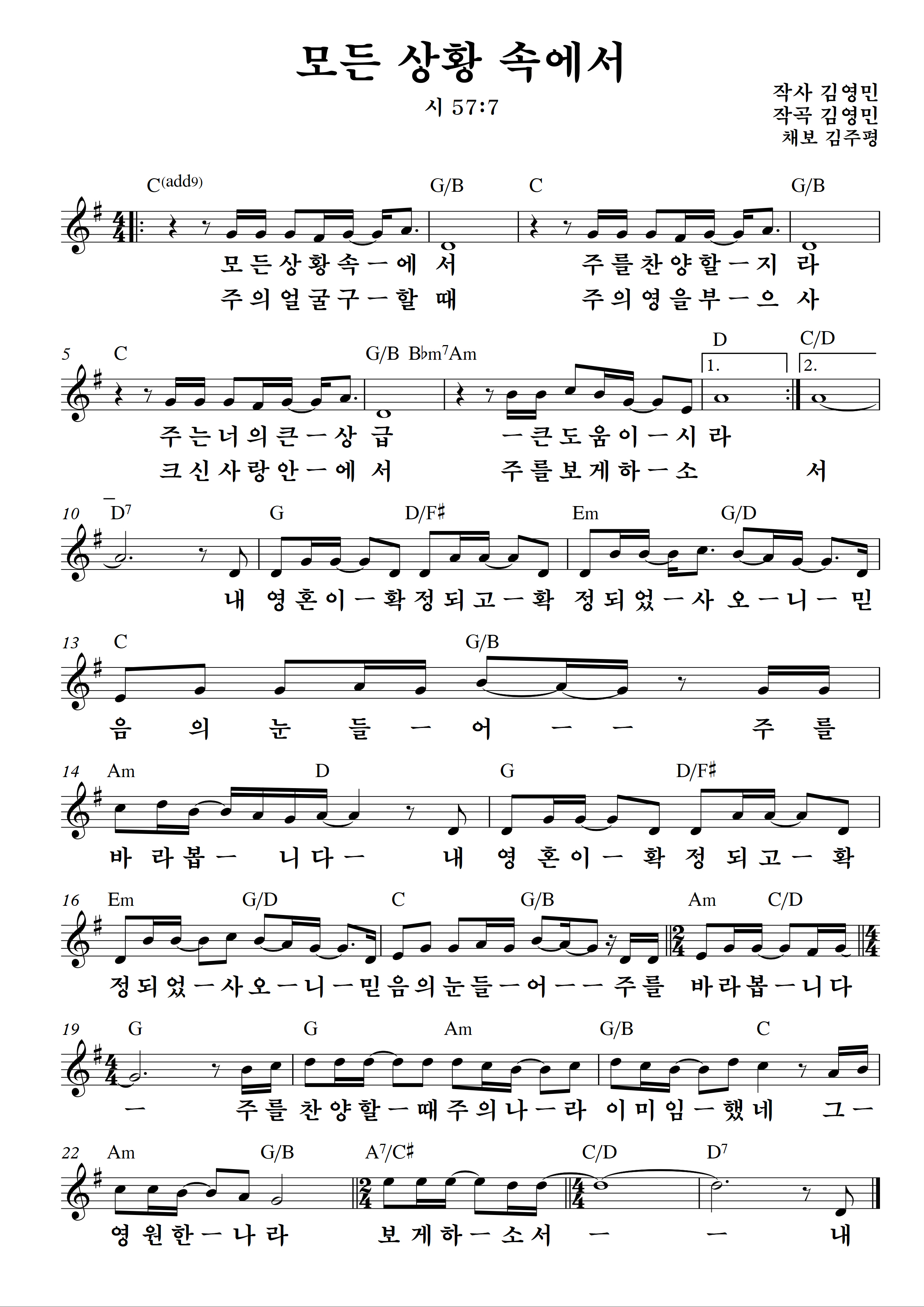 우리에게 잘 알려진 찬양 '모든 상황 속에서'의 악보입니다.