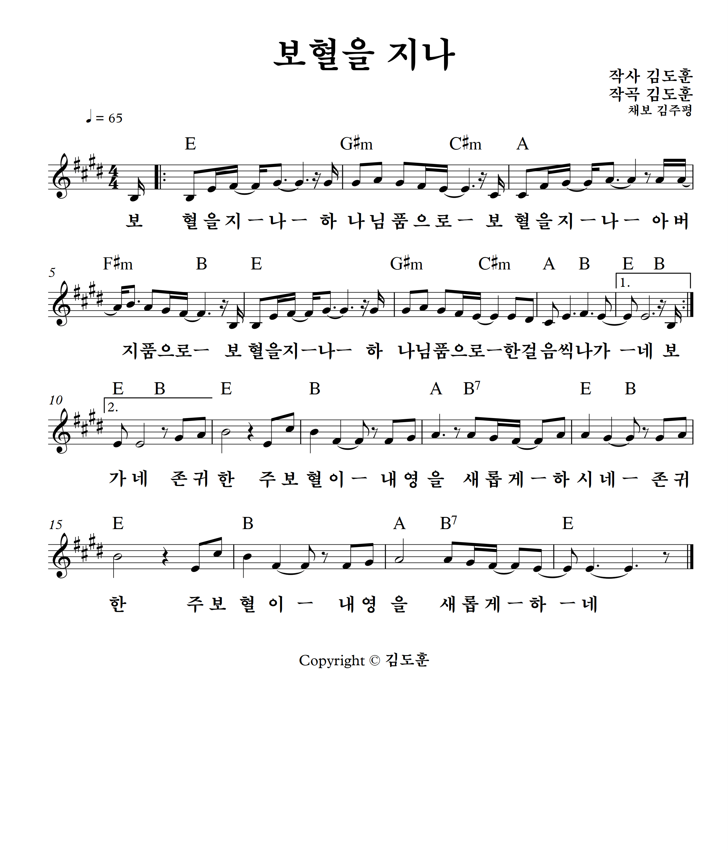 잘 알려진 복음성가 '보혈을 지나'의 악보를 그렸습니다.